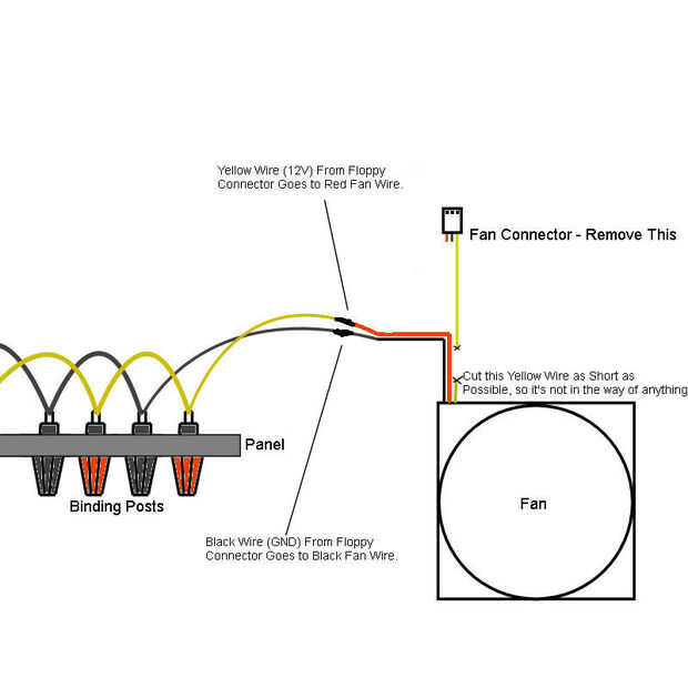 Una vez que has preparado los cables, soldar el cable floppy negro al cable negro del ventilador; luego soldar el cable floppy amarillo al cable rojo del ventilador. Después de soldar, asegúrese de que envolver los cables en envoltura de cinta adhesiva o retráctil eléctrico.