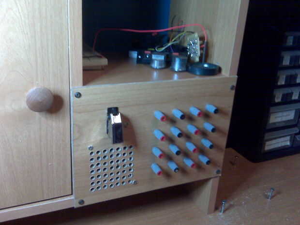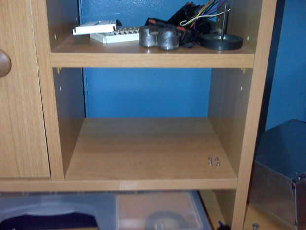 Una vez que todo está en buen estado de funcionamiento, poner la fuente de alimentación en el estante y luego cubrir el estante con el mismo panel. Mientras sostiene el estante en su lugar, perfore unos agujeros guía a través del panel/estante y empezar a fijar el panel en el estante con algunos tornillos.