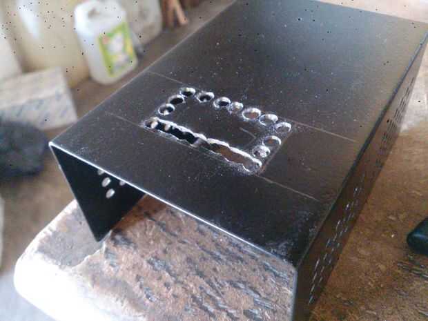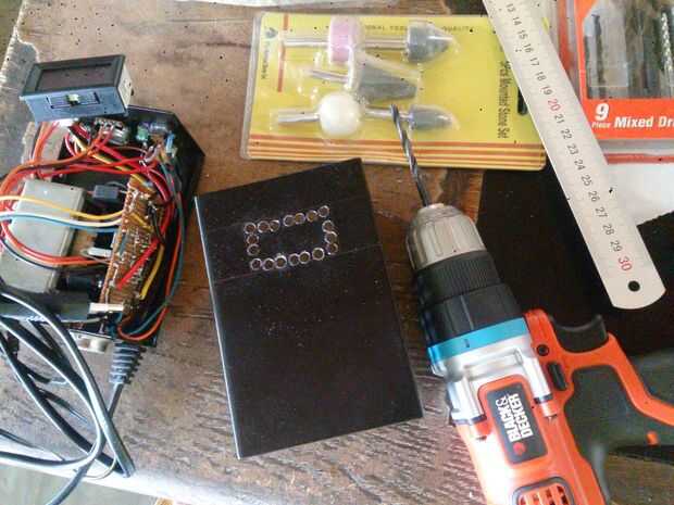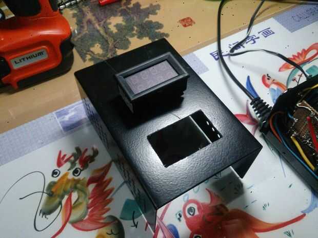 Configurar el medidor digital de doble pantalla en la parte superior el caso. Luego necesito más ejercicios. Un montón de ejercicios para hacer un agujero grande para la pantalla ya que no tengo Dremel cortador. Utilice una lima para limpiar el corte.