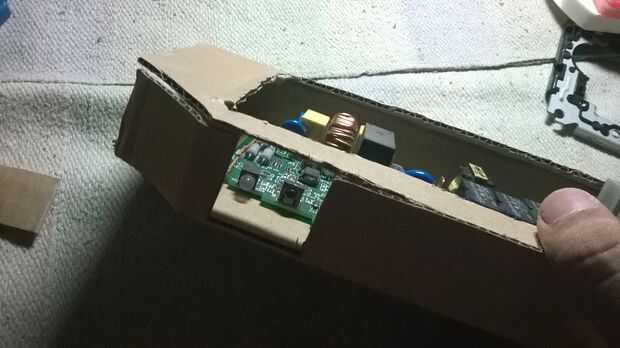 Después de instalar la placa de circuito con el cartón, doblar el resto de la Junta de la tarjeta para que sea una cubierta adecuada. Asegúrese de que cortar un agujero en el tablero de tarjeta cerca del interruptor de circuito para que pueda utilizar el interruptor.