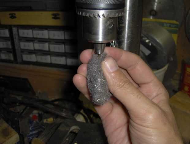 El latón sí mismo es la punta de la Eagle(r) de Papermate(r) en el paso 6. Como se encuentra, no es exactamente la forma que quieras que sea. Se forma como una punta de flecha y sólo un poco demasiado ancha para caber a través del orificio en el extremo del cuerpo Inc(r) Classic Gel (r). Así chuck esta punta de latón en mi taladro y moler abajo un poco, para que su forma se asemeja a una "bala" más que una "punta de flecha". Esto se muestra en la fotos 1-3.