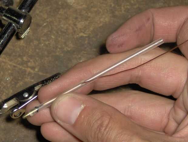 Siguiente soldar un trozo de alambre de cobre AWG 24 sólido en el extremo de esta punta de latón y pase el cable a través de ese pedazo de tubo de tinta y rellenar la punta en el extremo de la pieza de tubo de tinta. Por último, doble el alambre sobre y lo recorte. Esto se muestra en fotos 4-7.