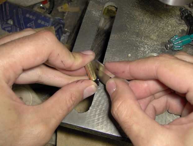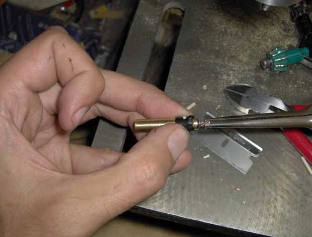 En el extremo que va dentro de la pluma, este émbolo de latón se injerta a una pieza del émbolo plástico original. Hice la decisión de casarse las dos piezas del émbolo juntos por dos razones. Uno es que las arboledas pequeñas que forman parte del mecanismo de émbolo original, lo deslice hacia adentro y hacia afuera suavemente. La segunda razón es que esta forma mantiene el émbolo de caerse de la parte superior de la pluma. Estas piezas de plástico y latón se mantienen unidas por un pasador de madera pequeña que solía ser parte de un palillo de dientes.