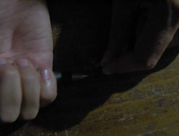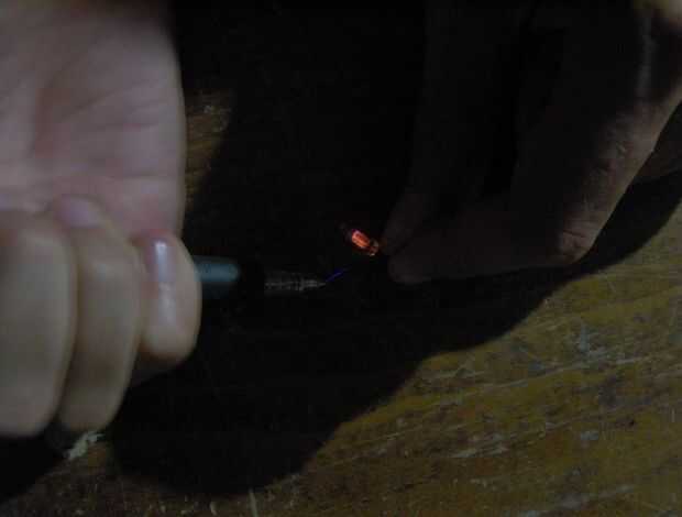 El pulso eléctrico producido por la pluma de piezoeléctrico puede iluminar brevemente varios tubos de gas llenadas.  Las imágenes de este paso me muestran zapping una lámpara indicadora de neón. El gas dentro de la pequeña lámpara de neón ilumina naranja cuando es excitado.