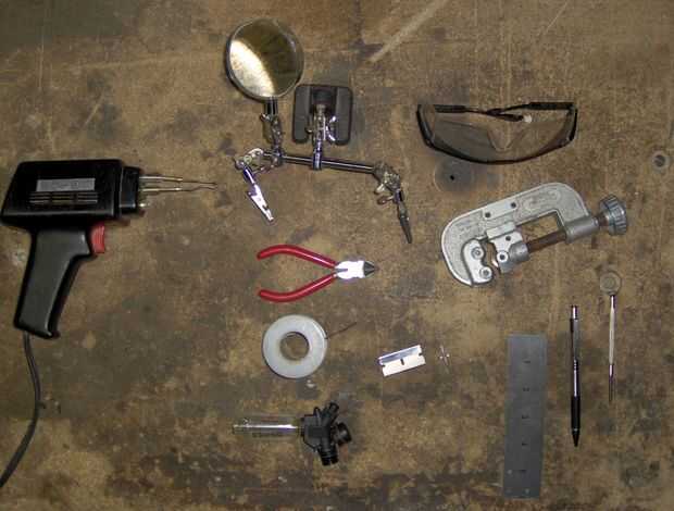 Tercera foto muestra gafas de seguridad, regla, lápiz, hoja de afeitar, cortadores de alambre, cortador de tubería, soldadura, manos, pistola de soldar, antorcha del butano pequeña.