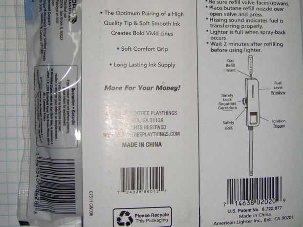 Estos materiales se muestran en la primera foto. La segunda foto muestra algunas de la materia de la parte posterior, UPC números, nombres de empresas y direcciones, advertencias y cosas y al menos un viejo número de patentes.