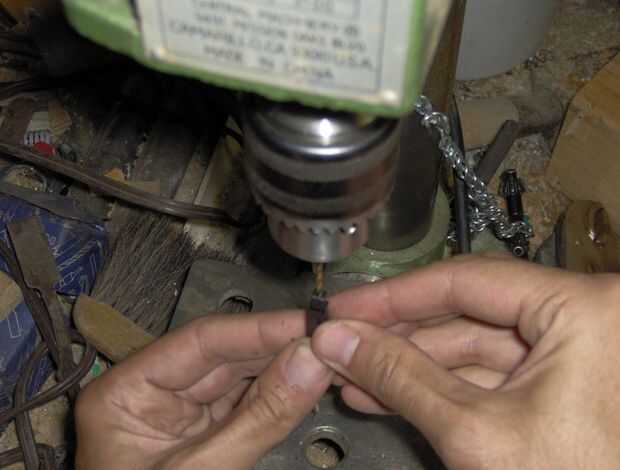 La razón por qué yo estoy perforando un agujero en la parte superior del módulo piezoeléctrico es debido a que esto proporciona una manera de conectar eléctricamente, el émbolo de latón en la parte superior de la pluma, con las piezas de metal pequeña dentro del módulo piezoeléctrico.