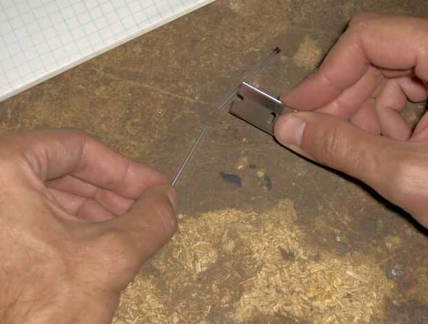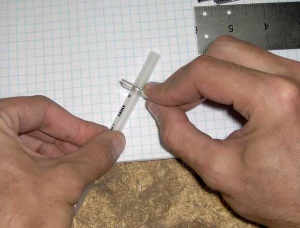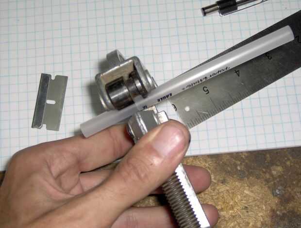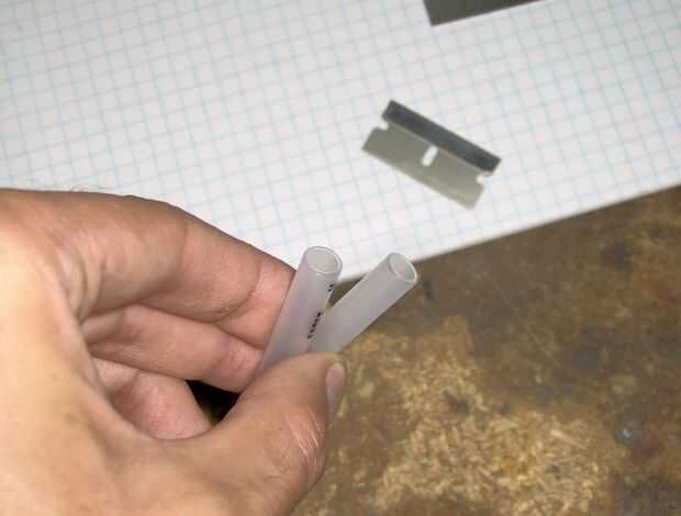 La mejor manera que he encontrado para cortar secciones de tubería de plástico de la pluma, por lo que conseguir un buen corte, es (1) marca el lugar donde quiero que la puntuación de corte, (2) esta marca utilizando un cortador de tubos, como el tipo de los utilizados para tubería para plomería de cobre de corte. Los puntajes de corte de tubo un círculo perfecto donde quiero el corte para ir, pero no lo logran realmente cortar tubos de plástico, que es por eso es necesario (3) Retire el tubo del cortador de la tubería y (4) go sobre el círculo anotó con una navaja afilada, "balanceo" de la pluma debajo de la hoja. Este método se muestra en los cuadros 1-3, y el resultante corte bastante extremos se muestran en la figura 4.