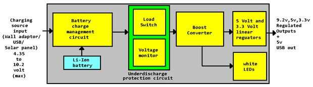La fuente de entrada de carga para la fuente de alimentación puede ser cualquier cosa de 4,35 a 10,2 voltios máximo que se puede aprovechar de adaptadores de alimentación de DC o USB puerto o 5 a 10 voltios panel solar (con un puente diodo en serie). Este DC entrada luego va para el circuito de gestión de carga de batería que un 3.7v batería de célula está conectada. Debe señalarse aquí que las baterías de Li-ion son muy sensibles a la carga de tensión y corriente y necesitan una estable fuente de carga. Mayoría de las células de carga a 4.1 o 4.2V / de la célula con una tolerancia de + / – 50mV/célula. Si el voltaje y la corriente de carga no es lo que debería ser como mayoría de la gente toma estas baterías de ion de litio y conéctelos directamente a cualquier fuente, esto no es correcto. Puedes terminar perdiendo la capacidad de la batería pronto y degradarlo. Así que al punto, es necesario un circuito dedicado de carga para la batería de iones de litio que ejecuta el algoritmo de carga necesario en su interior para cargar con seguridad. En el artículo más adelante, también discutimos la batería de Li-Ion carga técnica en breve. Siguiente la potencia de este circuito de gestión de la batería va en el circuito de protección de menores descarga de batería que continuamente monitorea el voltaje de la batería y cuando se alcanza cierto límite donde se supone que la batería se descarga completamente y debe cargarse de nuevo, se apaga la carga que está conectada a la siguiente sección así no más descarga la batería. Baterías de ion-litio de nuevo son muy sensibles a descarga límites, si se les descargan, entonces se alcanza un cierto límite donde la batería pierde su desempeño real y en algún momento no es posible recuperar de nuevo, por lo que es una descarga circuito de monitoreo debe tener. El circuito de protección de descarga menores no sólo apaga-fuera de la carga conectada a él, pero también Dile al usuario que la batería está agotada y necesita ser recargada otra vez. A continuación tenemos la sección de Boost converter es un convertidor DC-DC y su función radica en el hecho de que camina para arriba el bajo voltaje de CC a CC de alto voltaje. Aquí toma cualquier voltaje entre 2,95 voltios a 5,5 voltios y pasos de hasta 9,2 voltios. Sin embargo el convertidor puede ser configurado para un máximo paso a tensión de 15 voltios pero en nuestro caso, usaremos 9,2 voltios solamente y eso es suficiente para aplicaciones de energía portátiles. Después nos hemos derivado regulados 9,2 voltios de nuestra batería de ion de litio de 3,7 voltios, 5 voltios y 3,3 voltios positivos reguladores lineales se utilizan para derivar regularon de + 5 y + 3,3 voltios. Estos tres voltajes que son +9.2 v + 5v y + 3.3v se dirigen a un conector externo para que sea fácil de conectar sus proyectos. La regular (pero no corriente limitada) + 5v también va a un conector USB-A hembra para que puedan poder y cargar la mayoría de los USB powered productos. Usted puede conectar directamente incrustado aprendizaje kits como ARDUNIO tableros, MSP430 launchpad, etc. a esta fuente de alimentación + 5 v USB. Por último tenemos cuatro LEDs blancos conectados que cumple la función de linterna. Así está diseñado el circuito de la fuente de alimentación que no sólo ofrece rieles de voltaje regulada para alimentar sus cargas continuamente pero también garantiza la seguridad para la batería de iones de litio.