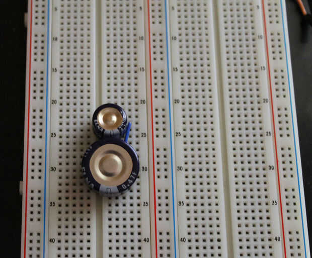 ** Respuesta ** Si respondiste "se duplicará el voltaje pero la capacitancia será menor que uno cualquiera de los condensadores en el circuito. La tienes razón! Sé lo que su decir, "no el voltaje 12.6?" y "Que fríe LED". El panel solar es sólo salida de 6.5V por lo que no tenemos nada que preocuparse. Por esta razón no estoy preocupado por equilibrar los condensadores. Si tuviera que aplicar un voltaje de carga 12.6V o superior entonces añado equilibrio.