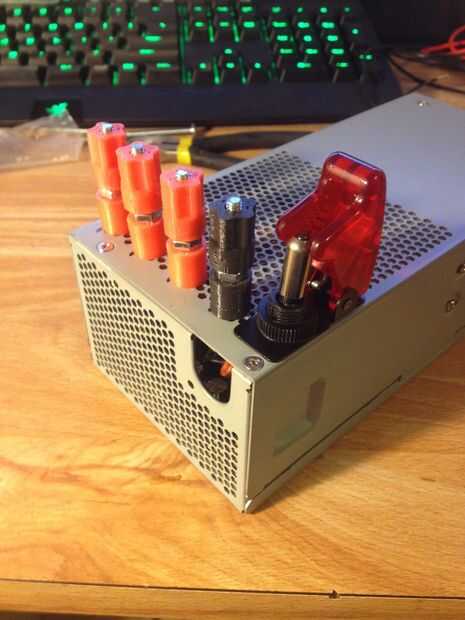 Ponga sus terminales y cambie en agujeros de allí y volver a montar el caso. Ahora conecte en el poder y sus voltajes de prueba. Ahora tienes una fuente de alimentación de escritorio barato.