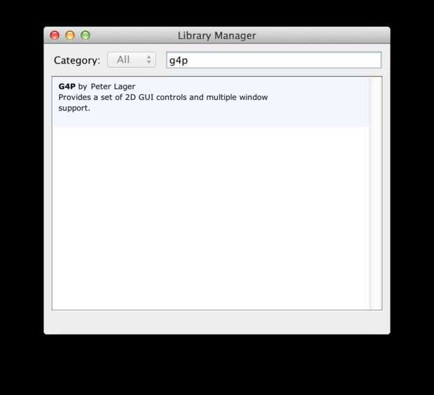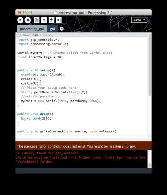 Si intentamos ejecutar el código de GUI en este punto, vemos que tenemos que instalar la biblioteca de g4p_controls.