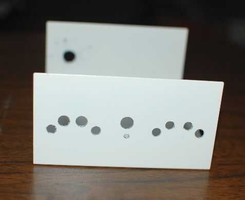 Encontrar el centro del panel frontal y taladre el primer agujero piloto aquí. Es difícil hacer grandes agujeros en el metal de hoja fino por lo que me gusta utilizar un escariador cónico como se muestra en la segunda foto para agrandar los agujeros. Este agujero es perforado de 1/4 de pulgada y luego ampliado a 3/8 de pulgada. He comprado el escariador cónico en Ace hardware.