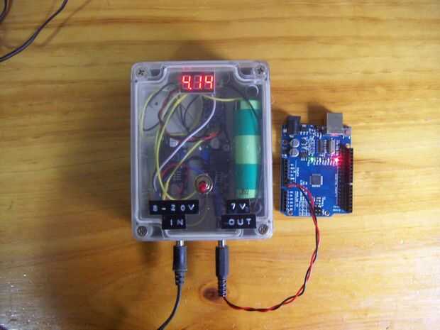 Esto es una fuente de la batería para una placa de arduino o cualquier proyecto de electrónica. Utiliza una batería de 18650 litio sola, un paso hacia abajo módulo, un módulo de gestión de carga y batería y un paso adelante el módulo. Puede cargarse de una amplia gama de voltaje hasta 30V y de red o energía solar. La batería está protegida de bajo y sobre voltaje.