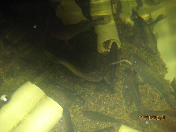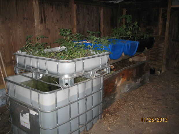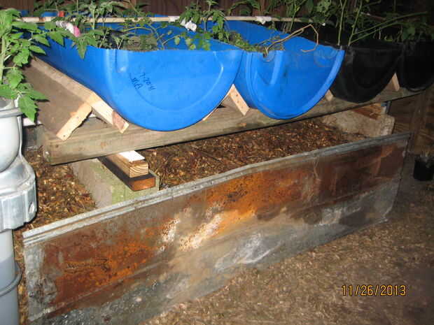 estoy cansada de todos el recuerda los alimentos que comemos y todos los químicos que están permitidos en y sobre las cosas que comemos. Este proyecto es tratar de levantar mi propio pescado y verduras durante el invierno. Es un trabajo en progreso. He cambiado cosas unas cuantas veces ya, el experimento más reciente es una fuente de calor natural para elevar la temperatura del agua en mi acuaponia. Es muy simple, coloqué dos hojas de metal debajo de mi cama crece. entonces les conectado con un pedazo de cadena. luego llenó de astillas de madera. Cualquier material de compost podría funcionar pero no apestan virutas de madera.