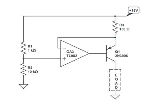 donde Vin es de la fuente de alimentación. De aquí, el Op Amp tiene espalda alimentación negativa (es decir, la salida está conectada a la entrada) y equilibra el V + y V-terminales para aproximadamente el mismo potencial. En otras palabras, el voltaje en la terminal V será el Vout del divisor de tensión. Así, la caída de voltaje a través de R3 se encuentra que la diferencia de 15 13.64 = 1 .36V. Esta caída de voltaje produce una corriente dada por la ley de Ohm de 1.36V / 150Ω, dando una corriente de 9.1 mA. Incluso con la adición de una cantidad insignificante de la corriente de la salida del Op Amp (un factor de 100 más pequeños), la corriente es constante a través del transistor, por lo que la salida a la carga es 9,1 mA.