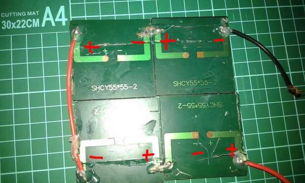 1. Organizar 4 células en forma cuadrada, conectar las células en serie por la ruta de acceso de soldadura como en la foto de arriba...