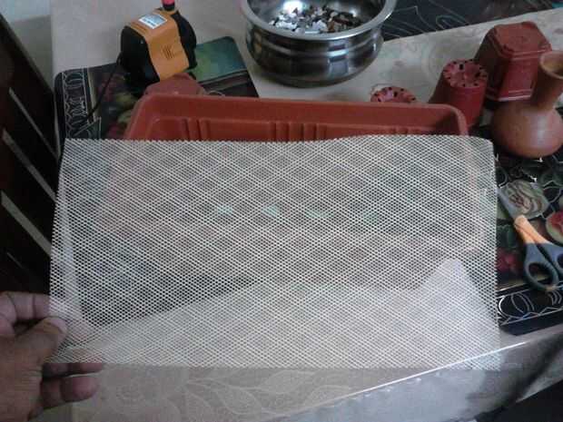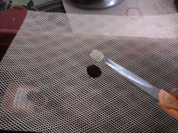 Tener una malla de alambre y cortar a la medida. Hacer agujero para la salida y fijarla con la masilla. Una hora para secar.