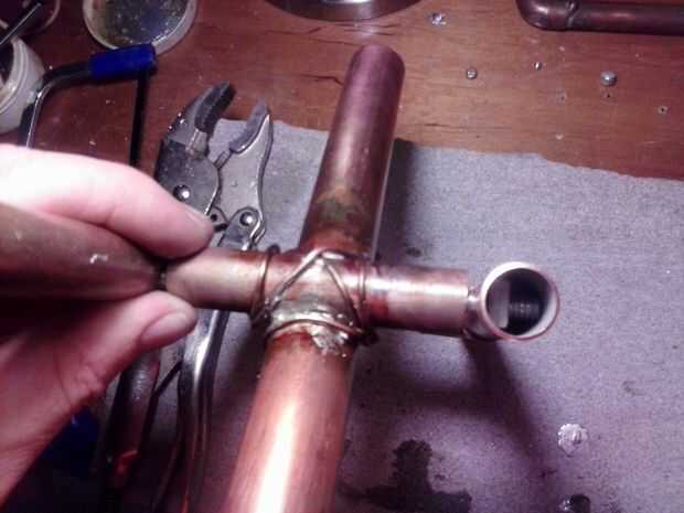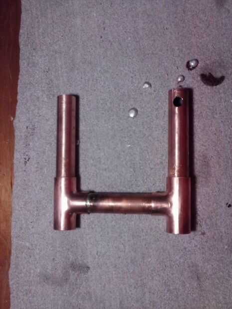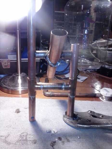 Una vez que todo se coloca, puede soldar a la tubería. Limpiar el tubo con el papel de lija y luego aplicar el fundente. Armar el tubo y la luz de la antorcha y aplique calor en la articulación de la tubería. Cuando está caliente y ves el flujo burbujeante, aplique la soldadura alrededor de la guarnición y dibujará la soldadura en el empalme. Limpie la soldadura con un trapo de tela. No tiene que ser perfecto o apretado como el agua por el tubo del agua pasará a través de un tubo más pequeño, no el tubo de cobre. Si no te gusta de la soldadura, luego pegar las piezas con pegamento epoxi o super. Taladre un agujero para la varilla roscada en los dos montantes. Puse una pequeño sqaure tuerca insdie una pipa y luego la varilla roscada en él. Puede ir el otro extremo en el agujero del otra en posición vertical y cuando se es soldar juntos se sentará en el agujero y eje.