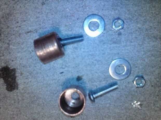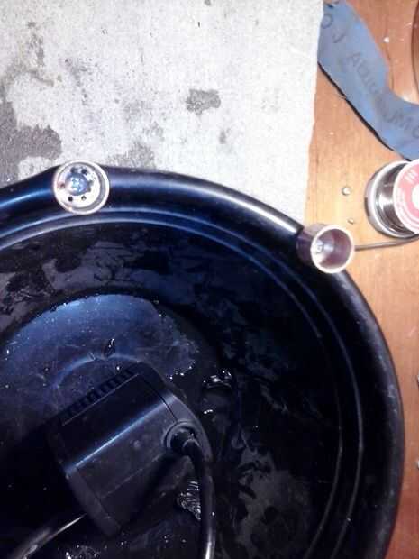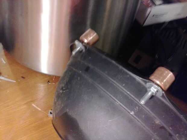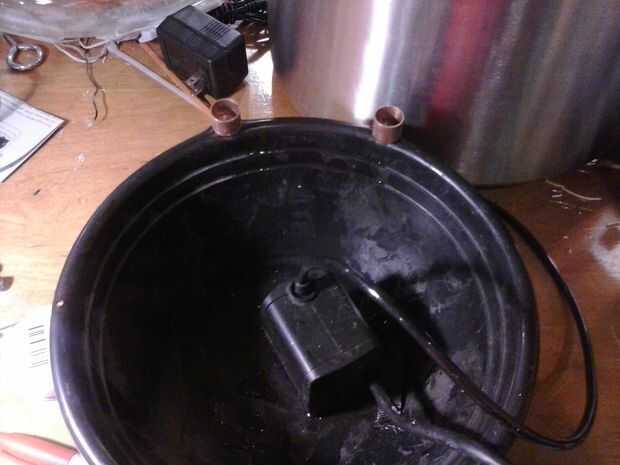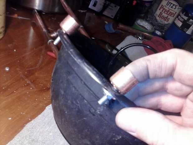 Haga dos orificios en el borde de la maceta de plástico. Perfore agujeros en el centro de las dos tapas de tubo de cobre. Tomar el perno y rosca a través de la tapa, el bote y entonces utilice una arandela y una tuerca para conectar. Esto mantendrá sus columnas y la fuente. También podría hacer el vertical ir más tiempo y a la estaca en el suelo en el jardín si lo prefiere. La bomba de la fuente irá en el fondo de la olla.