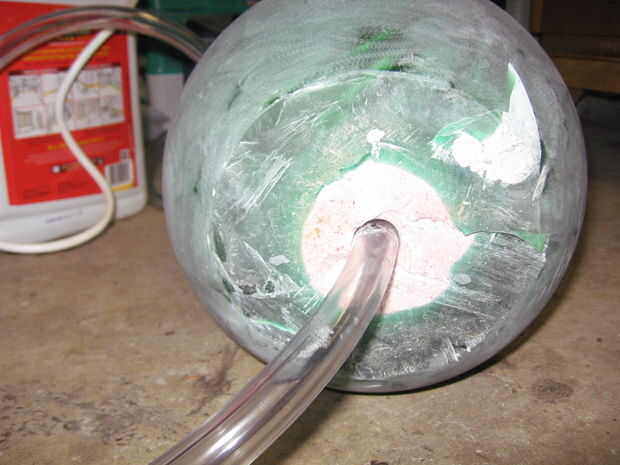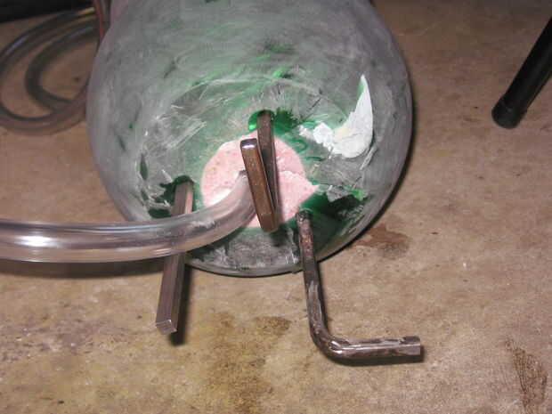 Después de que seque el ajuste las piernas mezclarían algunos epoxy. Unte la parte de la pierna destinada a empotrarse en la bola y coloque en el agujero. Tienen algunas toallas de papel o cartón de desecho cerca de así que usted puede limpiar cualquier exceso que puede gotear del agujero (o solo se puede lijar el exceso fuera más adelante). Repita este proceso para las otras piernas. Ahora dan el epoxi de un día para curar totalmente. Verticalmente y ver si cae.