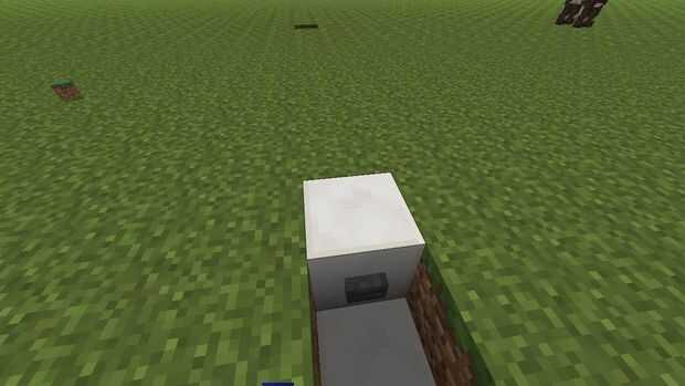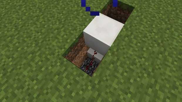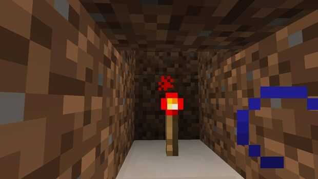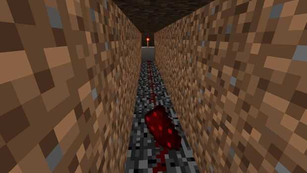 Ahora en un extremo del túnel el uno sin la escalera Coloque 1 en el terreno y colocar una antorcha de redstone en él luego coloque polvo de redstone en el suelo del túnel principal de la antorcha hasta la mitad para arriba de la escalera. Y colocar un bloque sobre el último polvo de redstone que coloca. Luego bloquee el el agujero al lado de él y lugar un botón que blanco te bloquee solo coloca