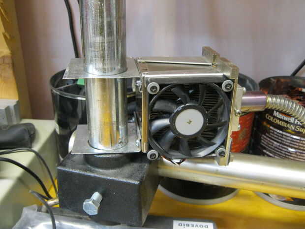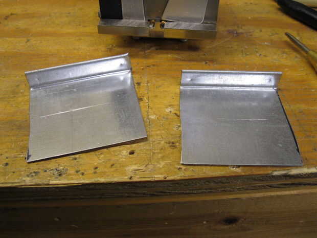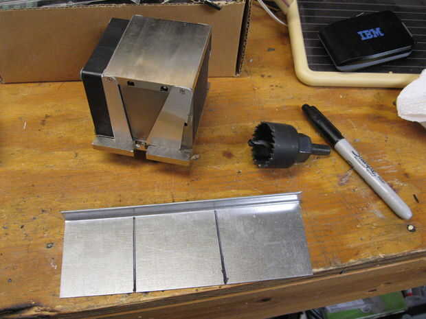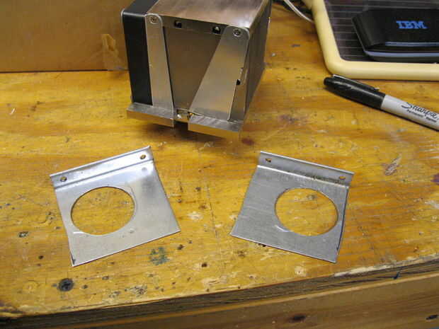 En primer lugar cortar dos cuadrados de 2.5" las piezas de la chapa HVAC así que cada pieza tenía un labio en un borde. Luego perforé 3 agujeros con mi taladro de columna (Asegúrese de que usted ajustar el metal cuando taladre. NO probar y sostener con la mano a menos que quiera perder un dedo.) Dos de los agujeros se encuentran en cualquiera de los extremos del labio pequeño para montar el soporte para el disipador de calor. El tercer agujero se encuentra medio del labio y el desplazamiento hacia un lado como alinea con la línea central del disipador de calor. Nota que tendrá que localizar este agujero en el extremo opuesto de los soportes para hacer un lado izquierdo y derecho cuando montados en el disipador de calor. Si perforado en el mismo lugar ellos se alinean cuando se instala en el disipador de calor. Perfore los 3 orificios con una broca #26.