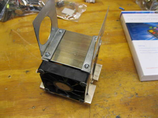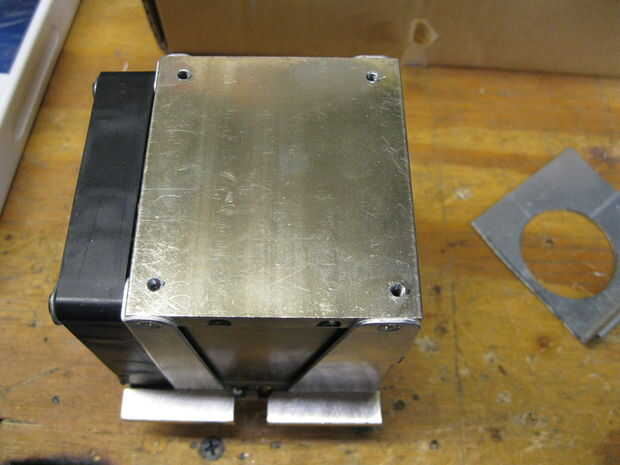 A continuación Alinee los soportes con los pequeños labios apuntando hacia dentro en el disipador de calor. Utilizando a un lápiz o punzón transferencia los 4 agujeros para el disipador de calor de montaje. Mi disipador de calor ocurrido tener una creo soporte placa en la parte superior del disipador de calor. Que no sea mirar hacia fuera para las pipas de calor pude perforar y aprovechar esto para el soporte de montaje. Centro las 4 ubicaciones de montaje (si no hecho ya) y con un centro perfore en un taladro de taladro piloto 4 todas las ubicaciones. Siguiente taladrar los agujeros con una broca #36. Toque a 6-32 (aprovechando las mismas reglas se aplican como antes.) y asegure los soportes de montaje como se muestra con corto 6-32 tornillos y arandelas de seguridad.