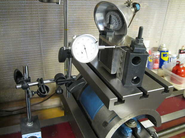 A continuación, establecer un indicador de dial en un borde del disipador de calor como se muestra. La lectura exacta no es importante lo que tu buscas es la lectura no moverse mientras se ejecuta el eje del molino perpendicular a la línea de calibre dentro y fuera. Golpee suavemente las esquinas del disipador de calor para ajustarlo. Una vez que la aguja no se mueve que más que una milésimas o lo apriete ambas mordazas. Verifique que el disipador no se mueve durante la abrazadera apriete ejecutando el eje hacia adentro y hacia afuera mientras observa el indicador de dial. Si todo está bien (calibre no o muy poco movimiento) el disipador de calor es paralelo a la mesa.