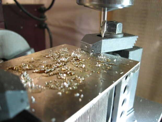 Primero montar el disipador CPU bocarriba en la mesa del molino. Mi disipador tenía 2 aristas que salían hacia fuera del cuerpo del disipador de calor. He utilizado un par de 1-2-3 bloques y abrazaderas de la mesa para fijar el disipador de calor. Apriete las abrazaderas a ceñido por ahora.