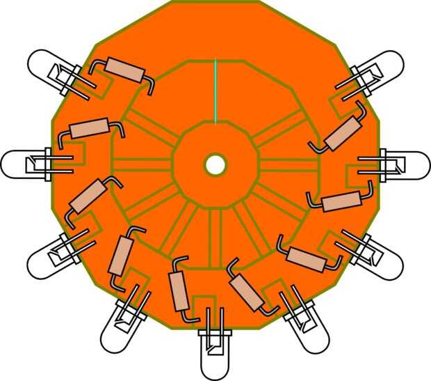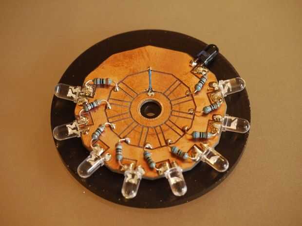 Vamos a tener un limpiador, procedente de un antiguo contacto de relé, póngase en contacto con la placa de circuito en uno de los botones en el anillo interior de las resistencias. El contacto con el suelo va a tocar el aro interior, unido por un pequeño cable azul enterrado en una ranura fresada, para el aro exterior, que completa el circuito de los LEDs.