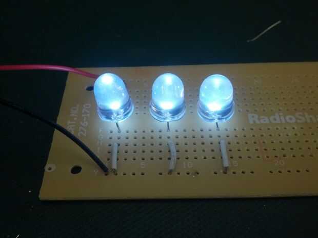 De lo contrario, analizar el circuito construido en la Junta de soldadura para asegurar que la corriente pasa de la + bus de batería de V a través de un resistor, a través del LED y el cable de nuevo al bus -V vuelta a la batería. Si la soldadura es un poco bruto allí puede ser algunos frío soldadura juntas o cojines rotos, que hacen se rompe en el camino para la corriente viajar. Asegúrese de que los LEDs son la manera correcta con el borde biselado (o plano) van al bus -V de la Junta de soldadura.