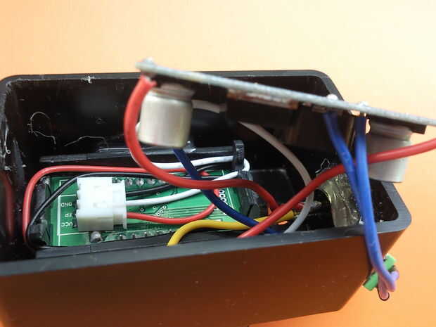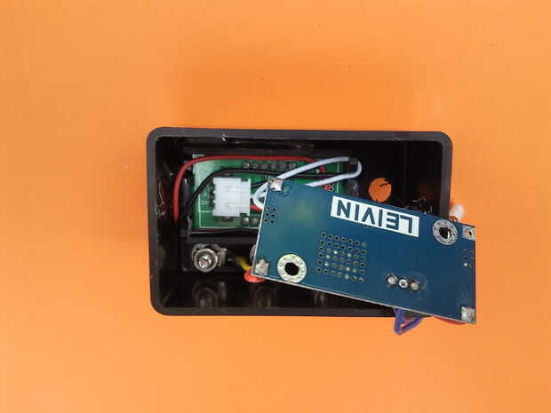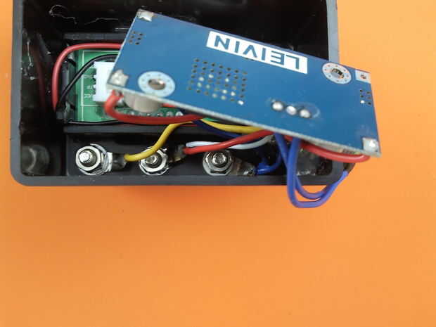 En la parte inferior puede ser visto el voltímetro de LED y el plátano montado y tomas de aviónicos. He utilizado pegamento caliente para hacer la construcción más fuerte.