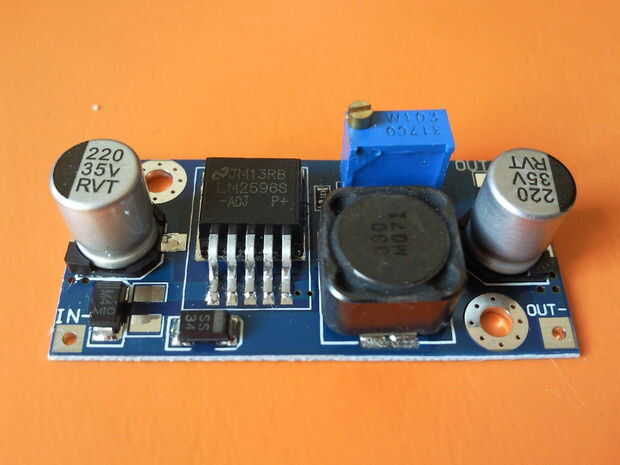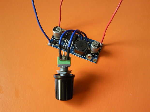 Para el regulador de tensión he utilizado un módulo de convertidor de DC/DC de paso descendente LM2596 (2 $ en ebay). Es capaz de producir voltaje de salida de 1.23 V para el valor de la aplicación en su voltaje de entrada. He decidido dar con la salida de 30V de la cuadra SMPS, lo que daría un rango de voltaje regulado de 1.23 V a ~ 30 V. Para fácil control manual de la tensión de salida, he unsoldered el potenciómetro azul y lo reemplazó con 10 KOhm potenciómetro con la perilla (1 $ en ebay). Para el módulo se muestra aquí, sólo dos cables son suficientes para esta conexión. En el módulo LM2596 dos de los terminales del potenciómetro están cortocircuitadas juntas. He puesto en cortocircuito también estos dos terminales sobre el potenciómetro (el medio y uno de los externos). Los cables de conexión de la Junta y el potenciómetro deben mantenerse tan cortos como sea posible.