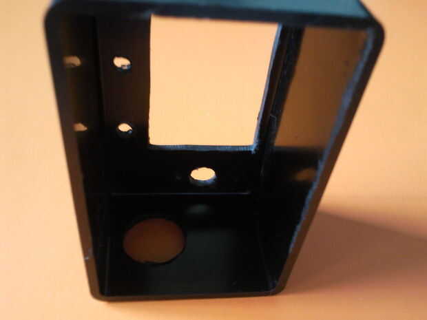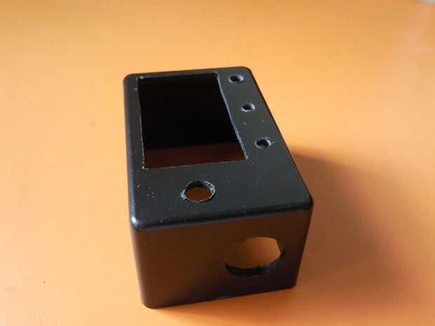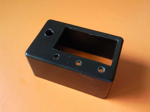 Todas estas piezas tuvieron que montarse en un caso plástico pequeño (tienda local - $2). Con una herramienta "Dremel", hice un aberturas y agujeros para el voltímetro de LED, el conector de la aviónica, el potenciómetro y los jacks banana.