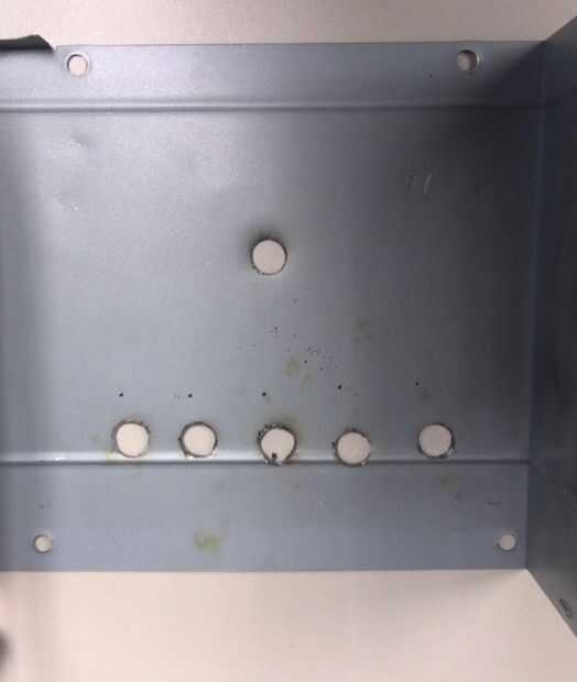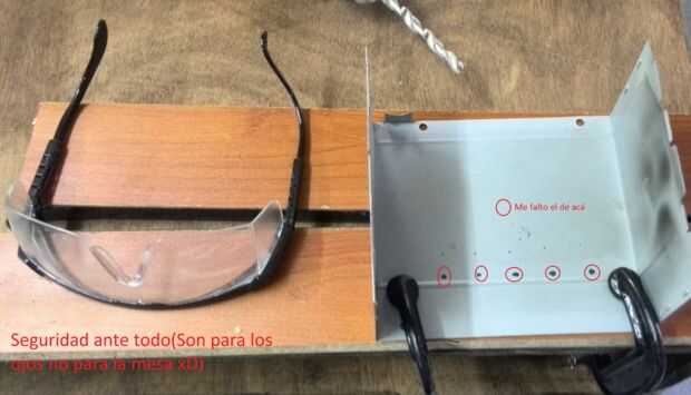 Marcamos donde queremos los conectores, sostenemos la tapa una mesa una con por debajo para de una tabla sin dañar la mesa y con un taladro eléctrico hacemos los agujeros, recuerda usar protección para los ojos al menos, en total son 6 agujeros 1 para la tierra y 5 los demás valores.