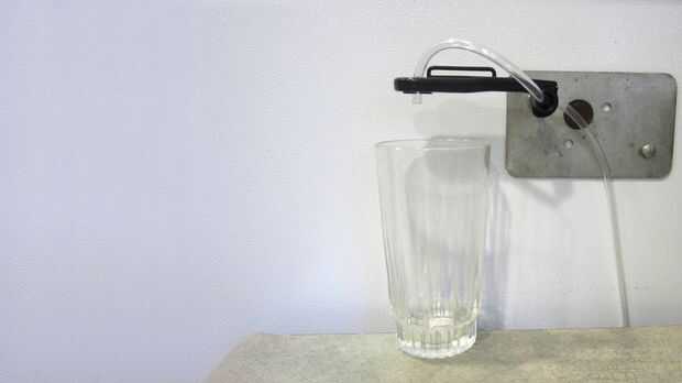 A continuación las mangueras de alimentación a través del lado del refrigerador. Fuera del refrigerador, debe conectarse la manguera de entrada a la bomba de aire. La manguera de salida se debe colocar en el lugar donde usted quiere ser capaz de llenar su copa.