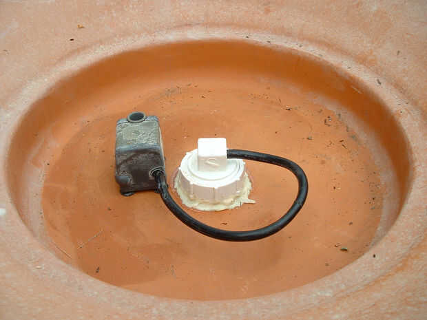 Un buje de tubería pegado al orificio inferior de la taza de terracota acepta el tapón de tubo. De esta manera, el tapón de tubo puede desenroscarse para quitar la bomba con el cable completo intacto para invernaje.