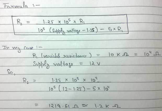 Usted puede encontrar fácilmente el valor de la resistencia de R2 en ohms utilizando la fórmula dada en la imagen de arriba. Colocar el valor de la variable resistencia (en ohmios) en 'R1' y la tensión de la fuente de energía en la alimentación.