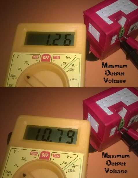 En el tiempo mientras tanto había hecho un gabinete para la fuente (sí tengo mucho tiempo que perder: p). también había substituido potenciómetro rotatorio con maceta rectangular (uno pequeño) para que la tensión no varía hasta que girar con un destornillador, pero la razón principal para reemplazarlo es debido a su precisión, es decir en girando el tornillo de este pote más pequeño , cambia voltaje a una velocidad menor que la tasa de la maceta más grande. También es muy compacto. Esta vez también he mostrado las fotos de las tensiones máximas y mínimas de la fuente, cuando se utiliza una fuente de 12 V como entrada (mi caso).