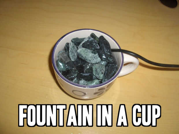 Después de practicar, he venido para arriba con una idea para hacer una fuente en una taza. La idea es simple, es increíblemente silencioso, el sonido es claro, además puedo moverlo alrededor cada vez que quiero.