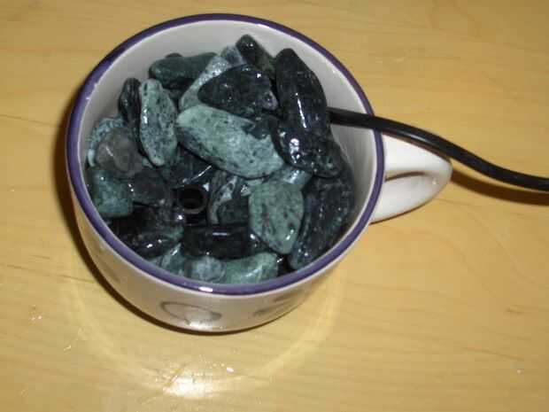 Ahora llene la taza con las piedras, dejar abierto el espacio por encima de la tubería de la bomba. Ayudarán a mantener todavía la bomba. También se necesita menos agua para operar la bomba, evitando resonancia fluida. Además son muy lindos.