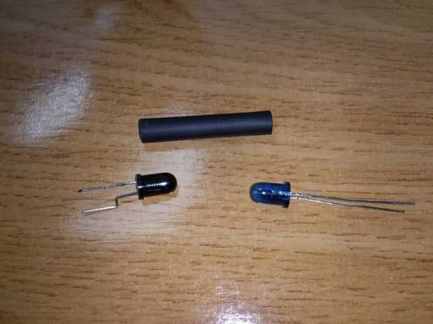 El optoacoplador es muy fácil, agarrar a sus IR led y sensor e insertar en el tubo del encogimiento, puede utilizar pinzas para ampliar antes de insertarlas por lo que caben más estrictos cuando calienta el tubo como se ve en la segunda foto.
