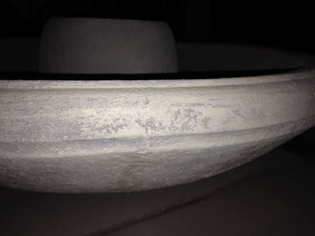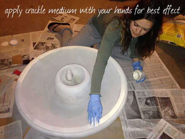 3. Luego, aplique el crujido medio con su mano (utilice guantes!) y frote toda la superficie de la cuenca en espesor al azar. El medio más va, más grandes serán las grietas y el deluente la capa del medio, las grietas más pequeñas. Yo quería que haya tanta variedad como sea posible, así que solo había cavado mi mano en el medio y había alisado al azar.
