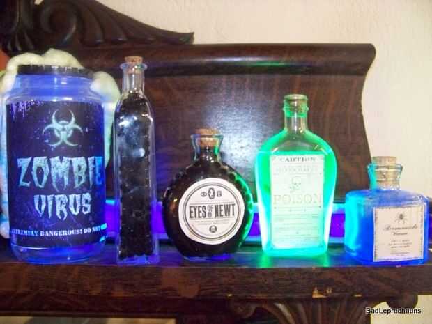 he coleccionado jarabe vacía, vinagre, worchestershire, adobo y botellas de aceite de oliva, junto con los tarros que velas, en el último año.  Hicieron una gran colección de botellas de la poción que hacen un buen Halloween cuando agrupados en una b