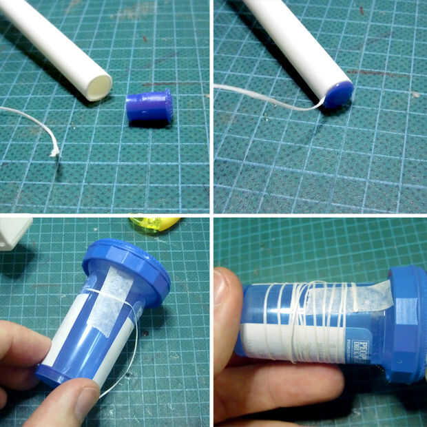 Utilizando el carrete de hilo extraído antes, envase de seda relajarse cerca de 6m (20') de hilo y cinta uno de los extremos a la botella de píldora vacía. Del viento el hilo alrededor de la botella de píldora, comenzando en el extremo de la tapa y terminando en la parte inferior de la botella dejando unos 30cm (1') de hilo flojo. Usando pegamento caliente, pegar la tapa de la botella de píldora en el contenedor de la seda. Asegúrese de que la botella de píldora se coloca apropiadamente para permitir que el carrete de hilo para ser lanzado sin coger en la parte inferior del cañón.