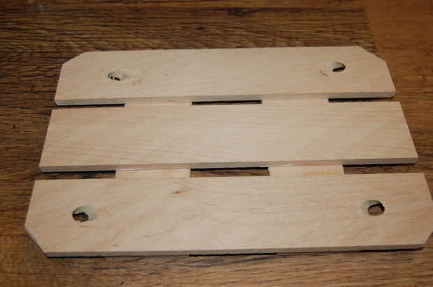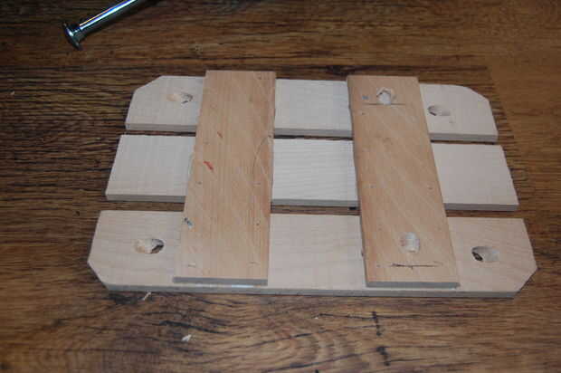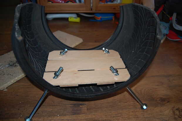Una vez que había puesto los tornillos por los agujeros y colocar el neumático en el suelo era evidente que necesitaría algo para apoyar las piernas. Decidí apoyar en dos direcciones así que cortar algunos recortes de madera, los agujeros perforados en ambos lados a 45 grados y poner sobre los pernos. Entonces había medido por las piezas transversales y pegado y había clavado todos juntos.