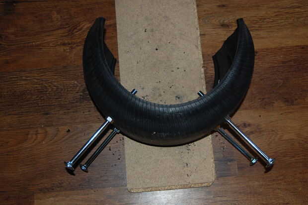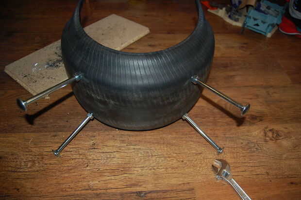 Cuando primero estaba pensando de esta tabla como una especie de patas de madera pero después de haber conseguido mi neumático delante de mí pensé que las piernas del metal sería buenas y tuve algunos pernos de coche de una cubierta del edificio el año pasado. Me marcaron las posiciones de las piernas en el neumático y taladrar los agujeros para los pernos. Usé una broca plana para madera y encontró que los agujeros debían ser enormes como la goma una vez contratados los agujeros fueron perforados. Para mi los pernos de 12mm usé un taladro de 16mm.