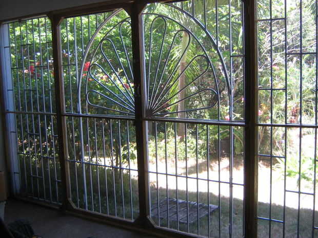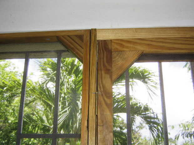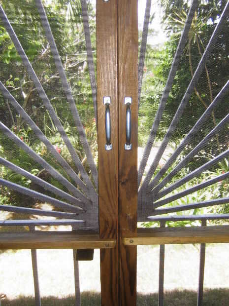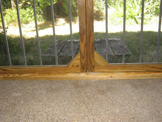 La tercera foto muestra el aspecto acabado agradable las abrazaderas de las esquinas dan el trabajo de la pantalla. Los pedazos de centro de puerta son los mismo 1 X 2, en el borde, atornillado a la puerta. Esto hace que para una barra de empuje fuerte. Pantalla normal de manijas, bisagras y ganchos de terminar el trabajo.