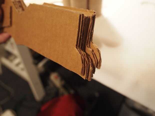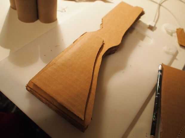 Cuando cortar el marco Asegúrese de dejar un labio en la parte delantera donde va la pieza que sostiene las barricas. Calcula todos los ángulos y cortes. Yo no iba para una réplica perfecta. Capas de alrededor de 5 piezas de cartón junto con una pieza más pequeña a cada lado para obtener la forma general de la pistola. Usé pegamento de madera para enganchar todos lo pedazos juntos y poner un montón de peso y dejó sentarse durante la noche.
